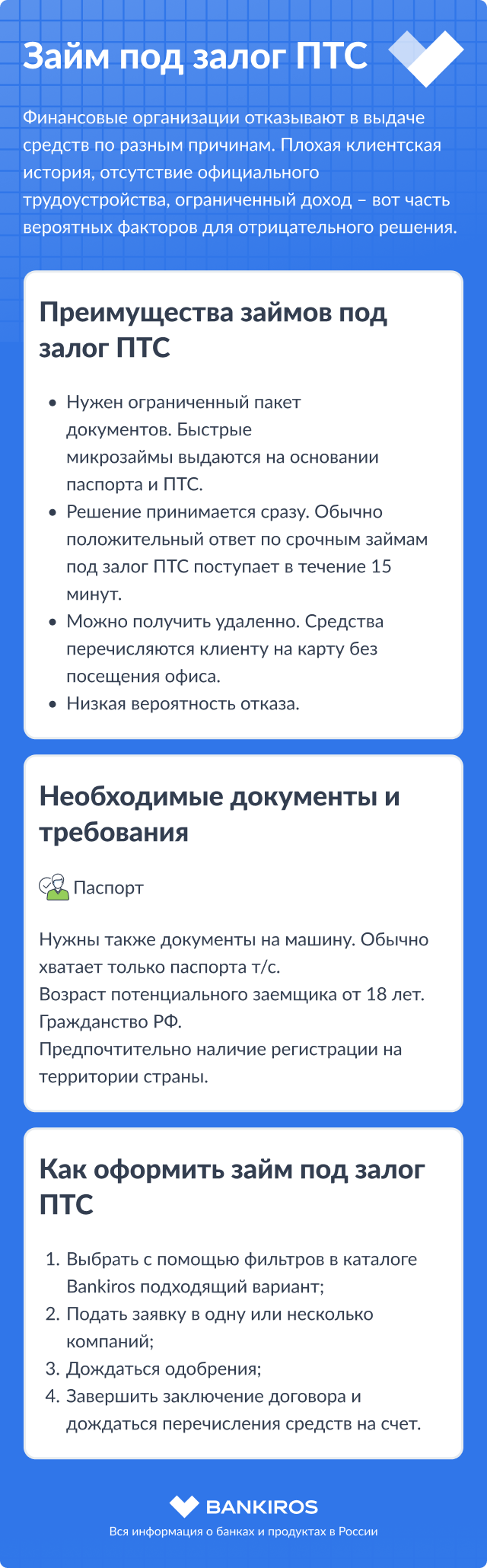 ПТС выступает документальным подтверждением сделки с предоставлением залога. По условиям МФО оформление договора без ПТС невозможно. Лишь некоторые фирмы предлагают альтернативные варианты. Например, оформление обременения и кредитного договора после предоставления расписки.