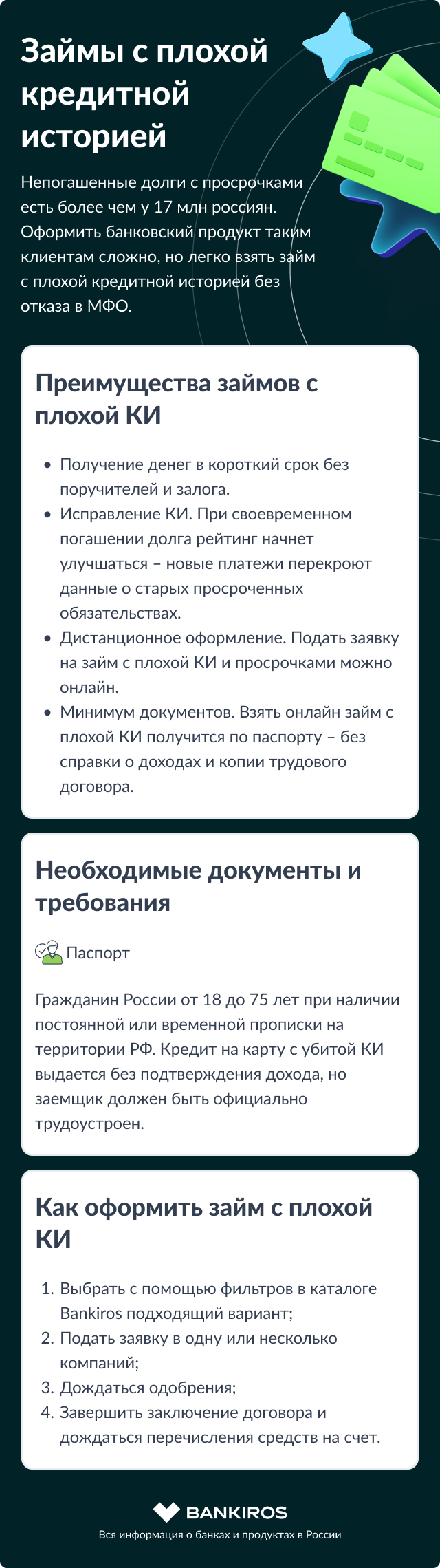 Непогашенные долги с просрочками есть более чем у 17 млн россиян. Оформить банковский продукт таким клиентам сложно, но легко взять займ с плохой кредитной историей без отказа в МФО. На Bankiros.ru удобно дистанционно подбирать микрокредит и оформлять заявку.